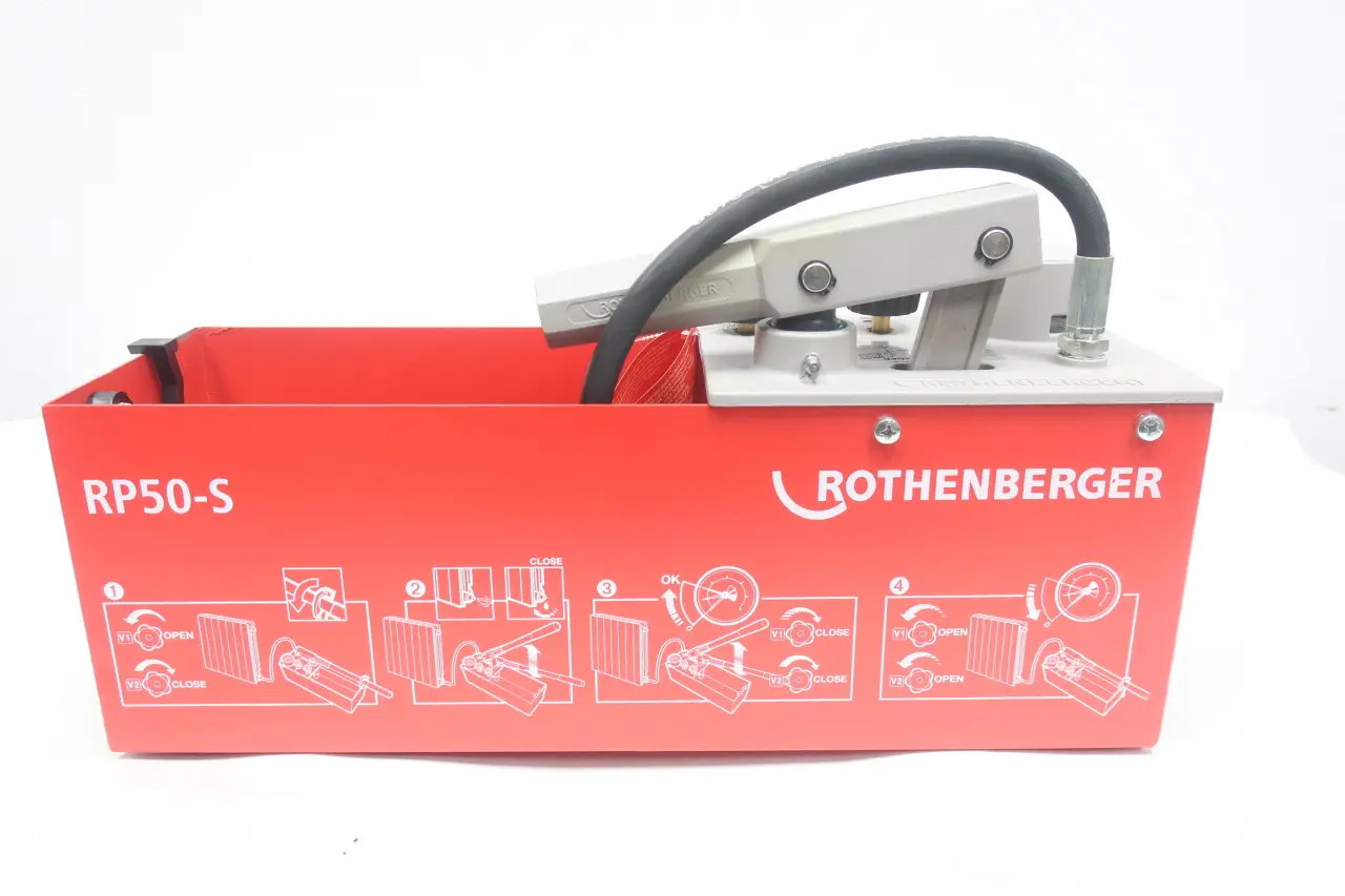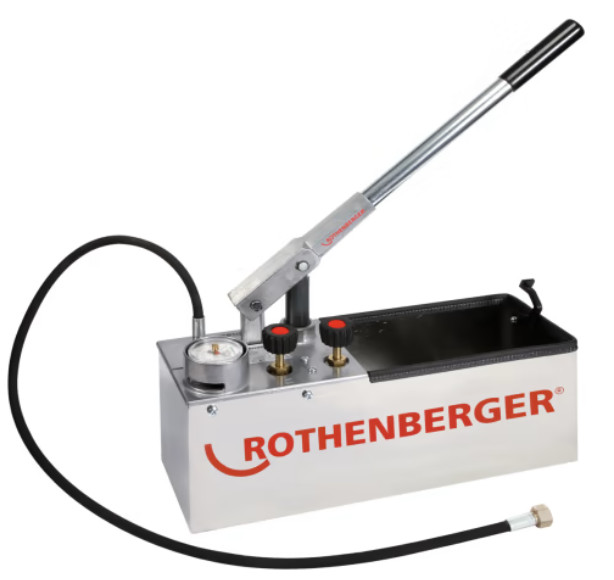 Rothenberger RP 50-S/RP 50-S INOX testing pump Bơm thử nghiệm độ chính xác cao để thử nghiệm áp suất của đường nước và bình chứa lên đến 60 bar với áp suất tiêu chuẩn kiểm tra rất cao. Kiểm tra áp suất bằng nước hoặc dầu của đường ống trong xây dựng dân dụng và công nghiệp, cũng như cho các thùng chứa công nghiệp (lên đến 60 bar). Có thể mở rộng với đồng hồ đo áp suất tỷ lệ cực tốt (0,1 bar) để kiểm tra tới 16 bar.